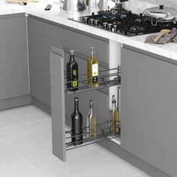 Caisse à bouteilles coulissante de 150 mm avec 2 étages et un fond en fil, disponible en version droite (R) et en couleur anthracite. Design moderne et fonctionnel, elle s'intègre parfaitement dans les meubles de cuisine ou de salon. Idéale pour un rangement aéré et organisé de vos bouteilles.