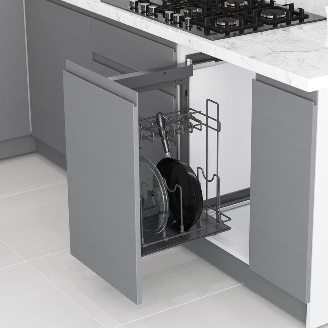 Caisse à casserole coulissante de 450 mm en anthracite, conçue pour une installation sur le côté droit (R). Idéale pour optimiser le rangement, elle offre un accès facile et une organisation pratique. Robuste et esthétique, elle s'intègre parfaitement aux cuisines modernes.