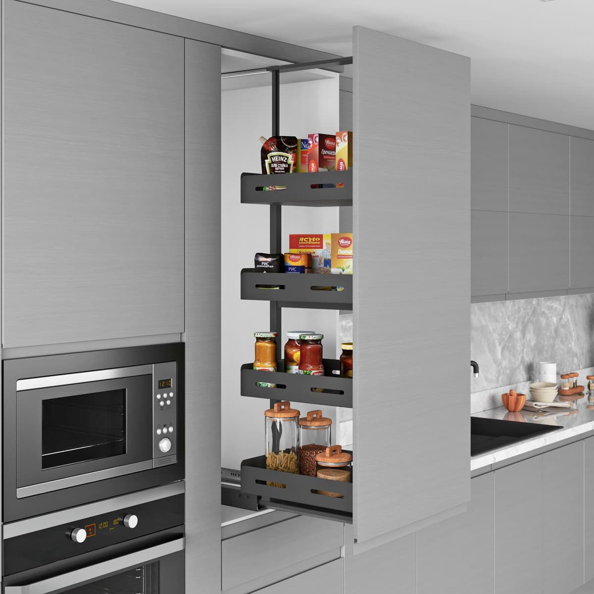 Le garde-manger coulissant à frein est un système de rangement pratique et ergonomique pour optimiser l’espace dans une cuisine. Équipé de 4 paniers B.U, il offre une organisation efficace et un accès facile aux provisions, Son design anthracite moderne et son système de freinage garantissent confort et esthétisme au quotidien.