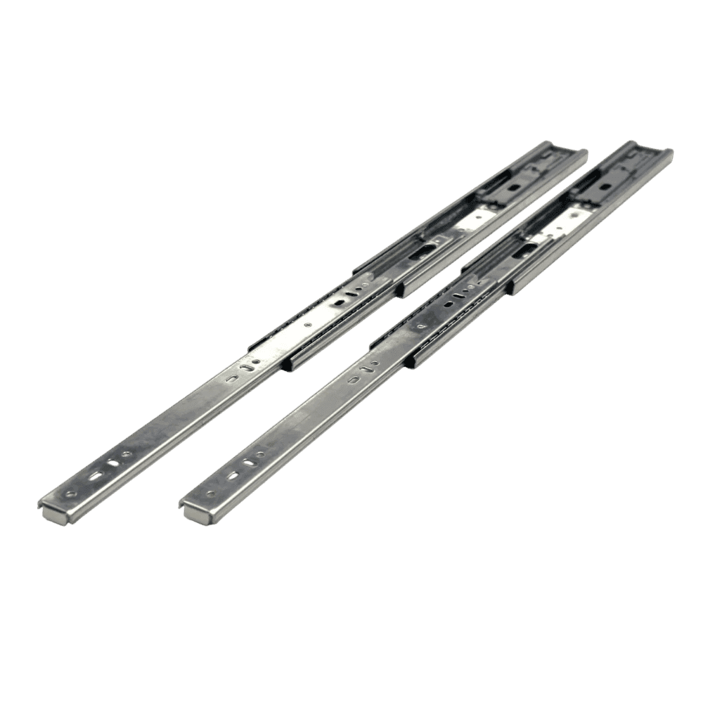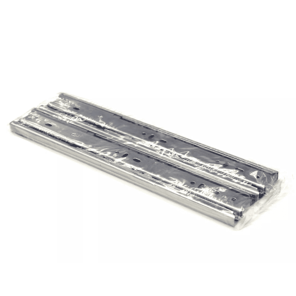 Ensemble de glissières à brilles à extraction totale avec roulements, offrant un mouvement fluide et silencieux. Capacité de charge de 30 kg, hauteur de 45 mm et épaisseur de 1,2 mm. Idéal pour tiroirs exigeant robustesse et durabilité, avec une installation facile et une excellente finition.