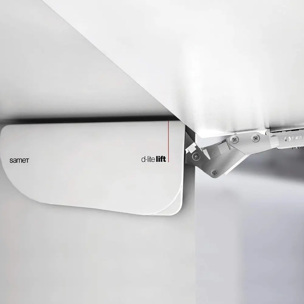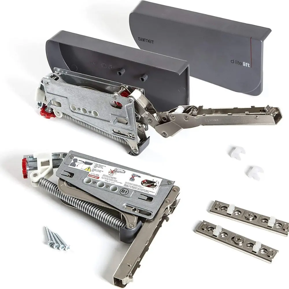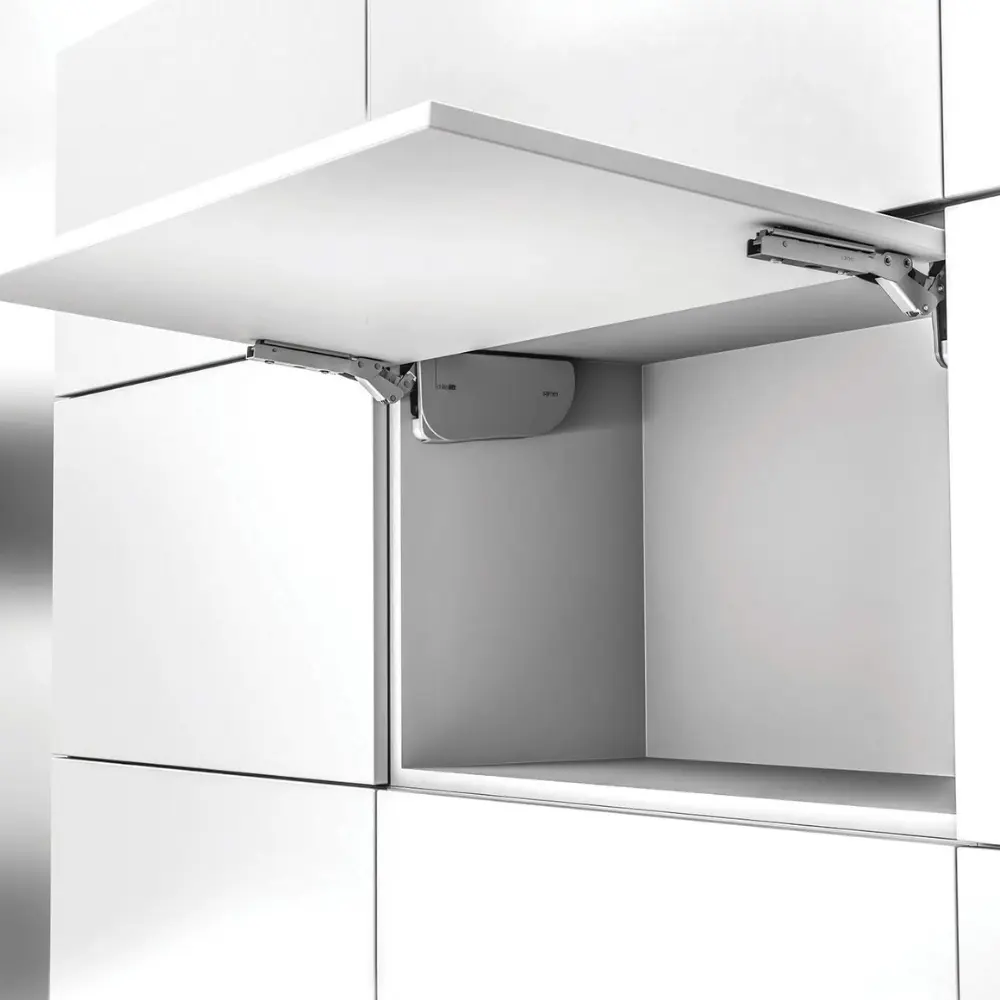 Kit mécanismes pour porte relevable, grâce à sa faible profondeur, est la solution idéale pour les petits meubles muraux, que ce soit dans la cuisine, la salle de bain ou la chambre. Adapté aux portes relevables d'une hauteur comprise entre 250 et 600 mm, il ne nécessite pas de charnières.