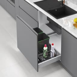 Poubelle de tiroir 800 mm en plastique avec couvercle automatique, panier intégré, finition anthracite. Grâce à sa capacité totale de 30 litres (2 bacs de 16L, 3 bacs de 1L) et son panier supplémentaire, elle offre un tri des déchets efficace et organisé.